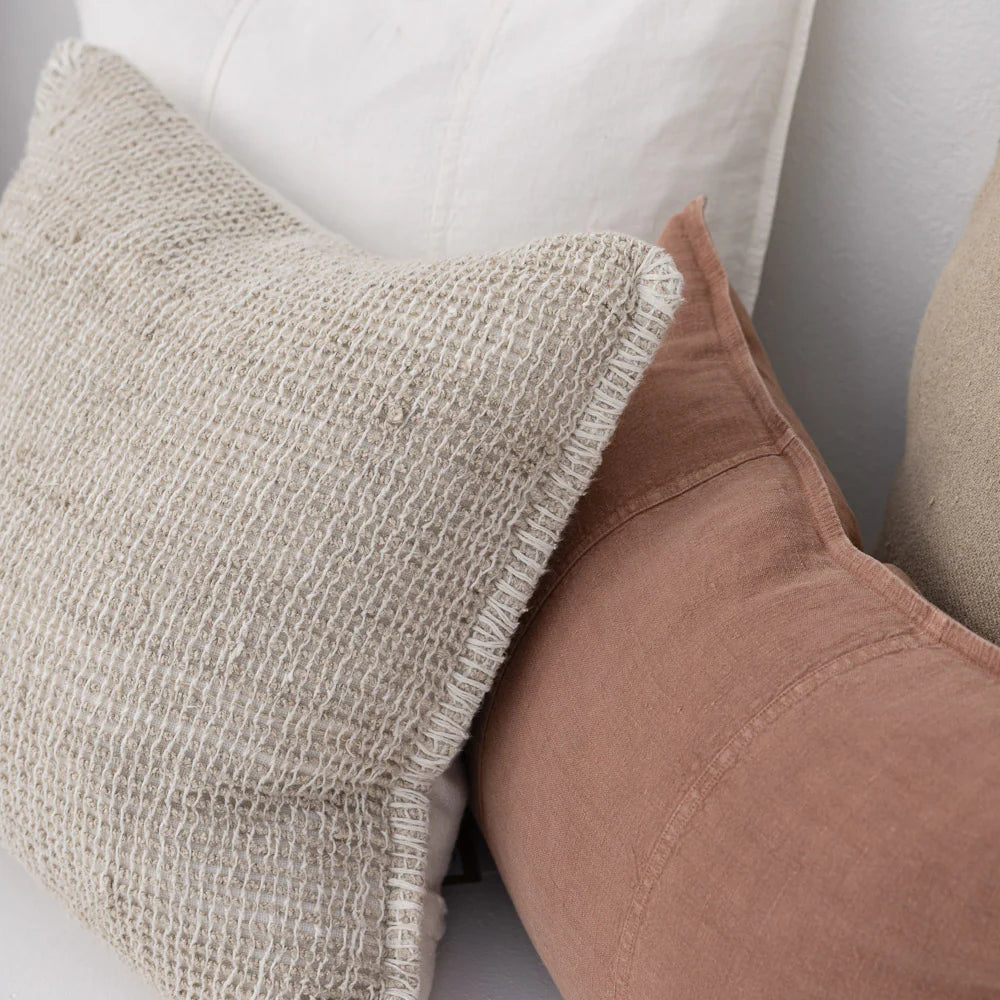 Handwoven from a linen-cotton blend, Solenne features a netted weave in natural and ivory yarns that enhances its organic character. Hand-stitched detailing along the sides adds a subtle artisanal touch, while the ivory linen backing keeps the palette soft and versatile, perfect for tonal styling. Please note: The Solenne Cushions are a product of recycled linen-cotton blend so there will be some natural imperfections and shedding.